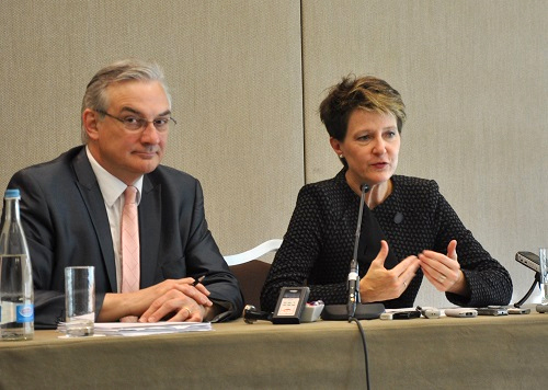 Conférence de presse et déjeuner traditionnel Présidentiel 2012 organisés en l'honneur et en présence de Présidente suissepar l'Association de la Presse Etrangère en Suisse et au Liechtenstein (APES) le 2.07.2012, à l'Hôtel Bellevue, à Berne, par les deux responsables APES, Emilia Nazarenko et Jean Musy, rédacteur en chef de Radio Zones